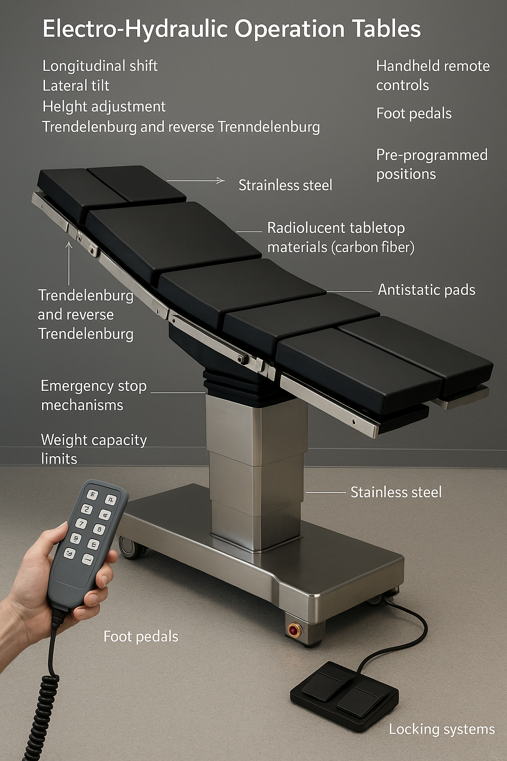 이러한 기능은 전기 유압 시스템이 환자의 안정성을 유지하면서 다양한 수술 요구 사항을 지원하는 방법을 보여줍니다.