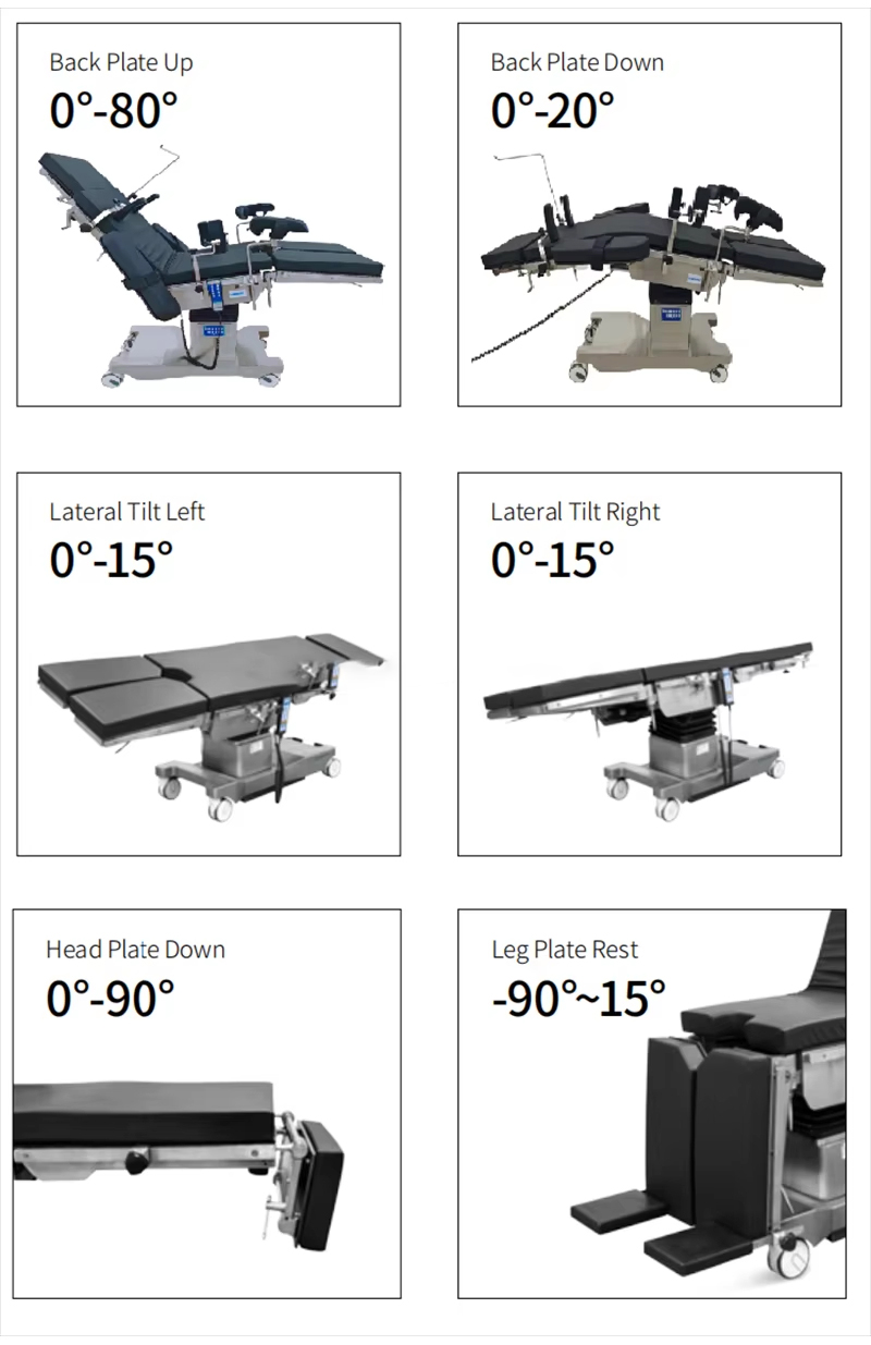 테이블 들어 올리기, 앞뒤로 기울이기, 좌우로 기울이기, 뒷판 위아래로 접기 및 이동은 모두 전동 푸시로드에 의해 제어됩니다.