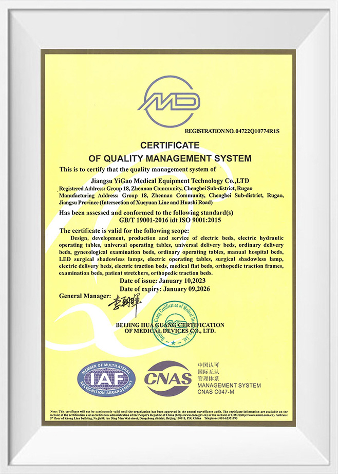 합격한 기업으로 ISO 9001, ISO 13485, ISO 14001, ISO 45001 및 기타 관리 시스템 인증을 획득한 강소 Yigao 의료 장비 기술 유한 회사는 제품 품질을 생명선으로 간주합니다. 우리의 수술대는 엄격히 준수합니다 CE 표준 이는 유럽 시장의 안전, 건강 및 환경 요구 사항을 충족할 뿐만 아니라 제품 설계 및 제조 분야에서 국제 선두 수준을 대표한다는 의미입니다.